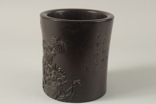 A FINE AND LARGE 18TH-19TH CENTURY HARDWOOD BITONG BRUSH POT, with finely carved relief floral decoration and incised inscription, 18cm high.