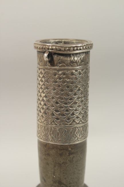 A RARE 18TH CENTURY MUGHAL INDIAN SILVER MOUNTED LEAD SURAHI BOTTLE, 30cm high.