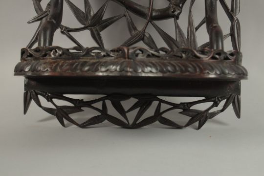 A CHINESE CARVED OPENWORK HARDWOOD WALL SHELF, carved with bamboo tree design, 46cm high.
