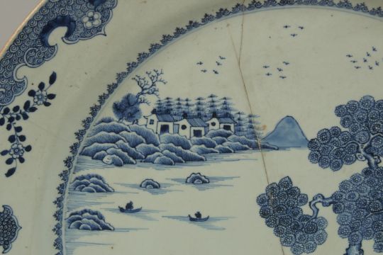 A VERY LARGE CHINESE BLUE AND WHITE PORCELAIN CHARGER, (af), 55cm diameter.