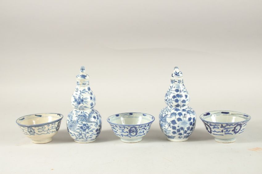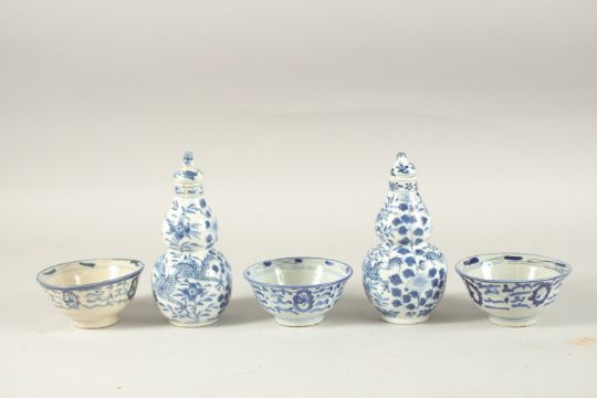 THREE CHINESE BLUE AND WHITE BOWLS, together with a pair of lidded gourd vases, (af).