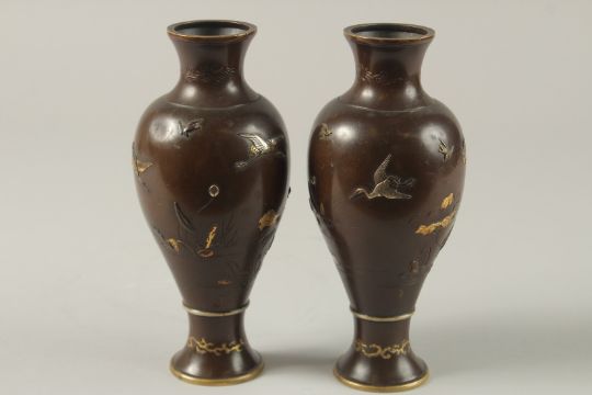 A FINE PAIR OF JAPANESE MEIJI PERIOD MIXED METAL INLAID BRONZE VASES, decorated with gilt and silver cranes and flora, each signed to base, 18cm high.