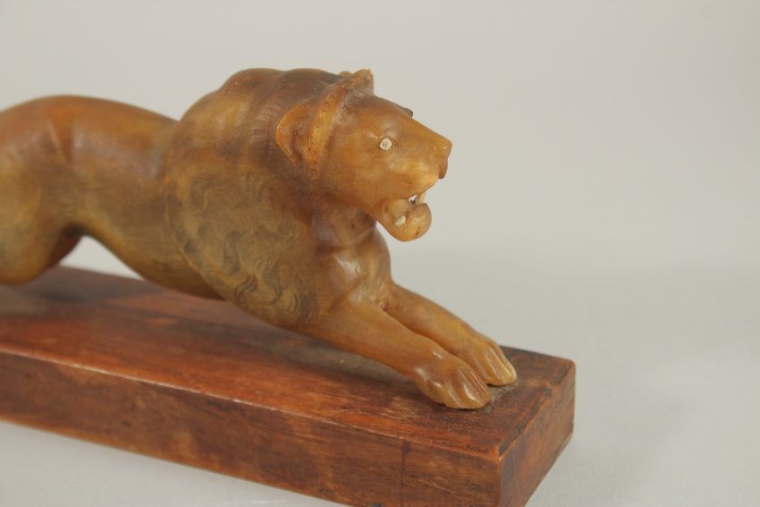 A PAIR OF 19TH CENTURY INDIAN CARVED HORN LIONS ON WOODEN STANDS, 20cm long (excl. base).