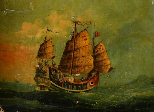 19TH CENTURY ANGLO-CHINESE SCHOOL, A JUNK AT FULL SAIL, oil on canvas, 17" x 22.75" (43 x 58cm) (unstretched) (unframed).