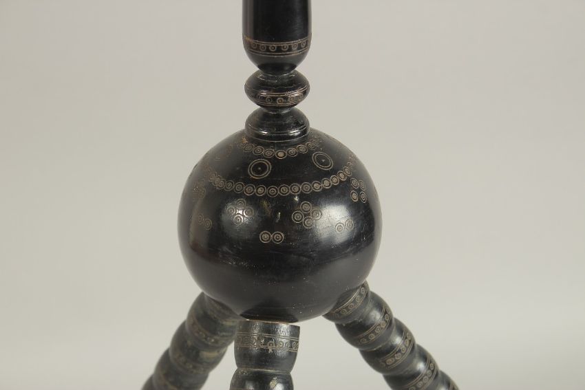 A 19TH CENTURY INDIAN KASHMIR LACQUERED WOOD TABLE, with detachable base and three turned wooden legs, 64cm high, top 39cm diameter.