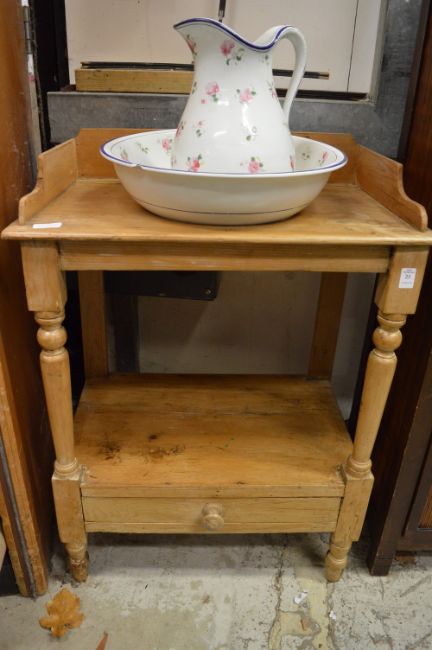 A pine washstand with jug and bowl.