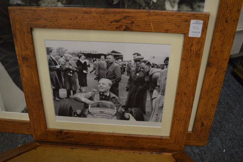 A large photographic print of the racing driver Michael Hawthorn with facsimile signature together with associated photographic prints, all uniformly framed and glazed.