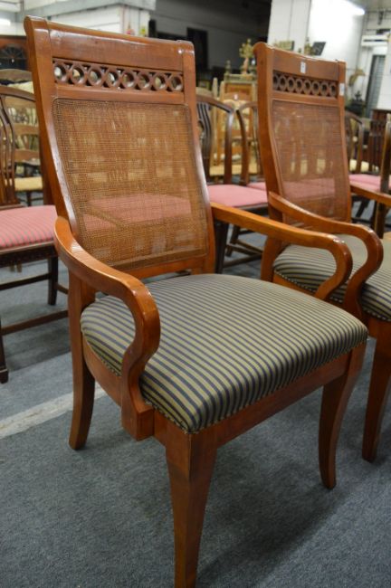 A set of ten hardwood dining chairs with striped upholstered seats and cane work back panels, two with arms.