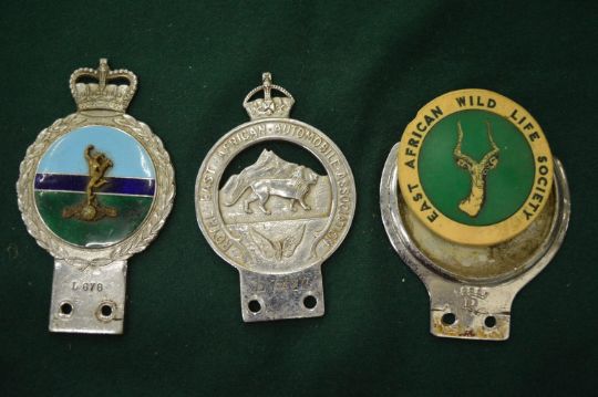 A chrome plated Royal East African automobile association bumper badge and two others.