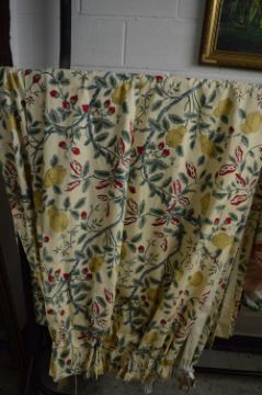 A single floral curtain, lined approx size 218cm wide x 400cm long together with a matching curtain 74cm wide x 400cm long and two cushion.