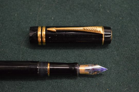 A Mont Blanc ballpoint pen, a Parker Duofold fountain pen and various other pens and accessories.