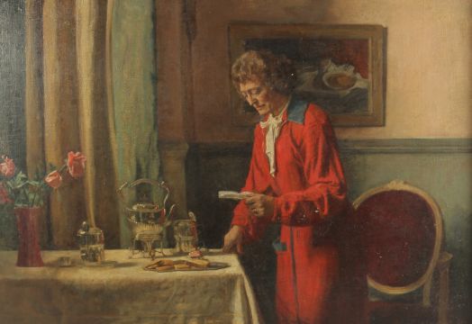 Interior. A lady at a table with a tea kettle, mug and tray of biscuits. Signed and dated 1987.