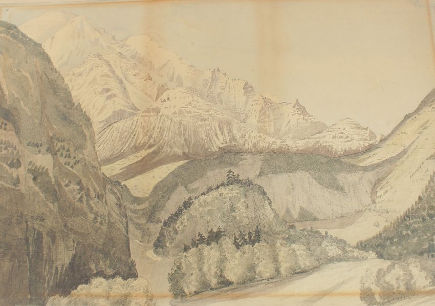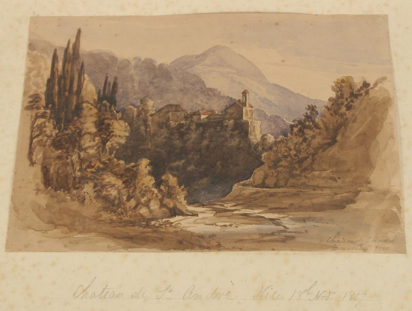 19th Century English School, 'Chateau de St Andre, Nice', watercolour, inscribed and dated 18th Nov 1857 in pencil, 7" x 10", (17.5x25.5cm) together with a 20th Century Alpine view, watercolour, 14.5" x 21.25, (37x54.5cm) (2).