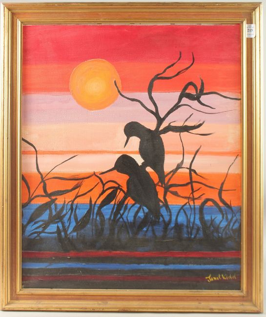 Birds on a tree by water with the setting sun, oil on canvas.