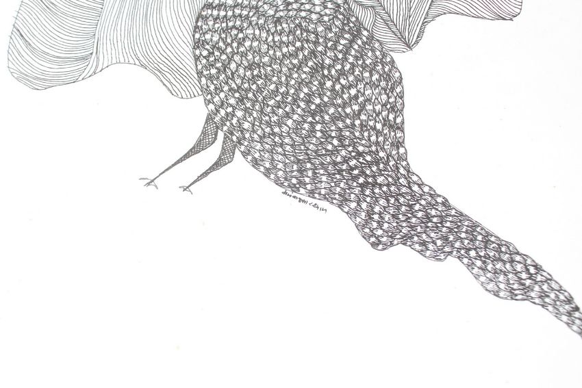 RAM SINGH URVETI (B. 1970) INDIAN GOND ARTIST. A bird by tall grass, ink on paper.