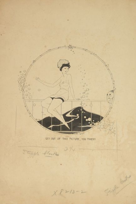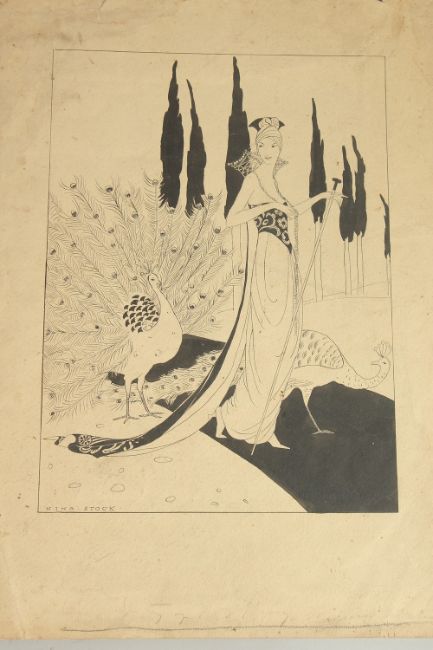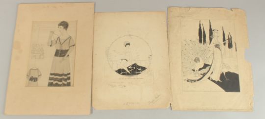 Circle of George Wolfe Plank, an ink drawing of an elegant female figure with two peacocks, image size 11.5" x 8" (29 x 20cm) along with another by the same hand and another by a different hand, all unframed (3).