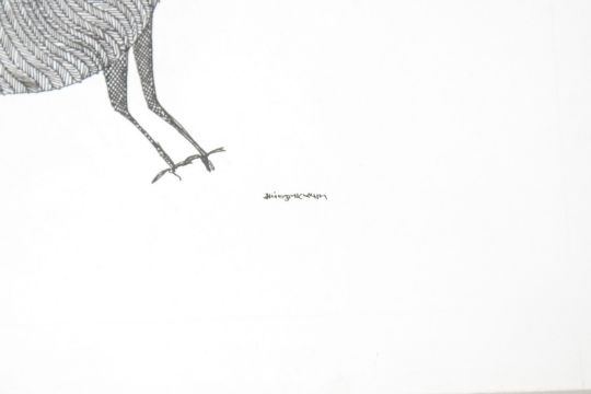 A bird beneath a tree, ink on paper.