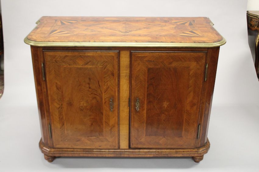 A RARE 18TH-19TH CENTURY MALTESE COMMODE, inlaid and crossbanded with coloured woods, the front with double panel doors enclosing a pine interior with shelf.