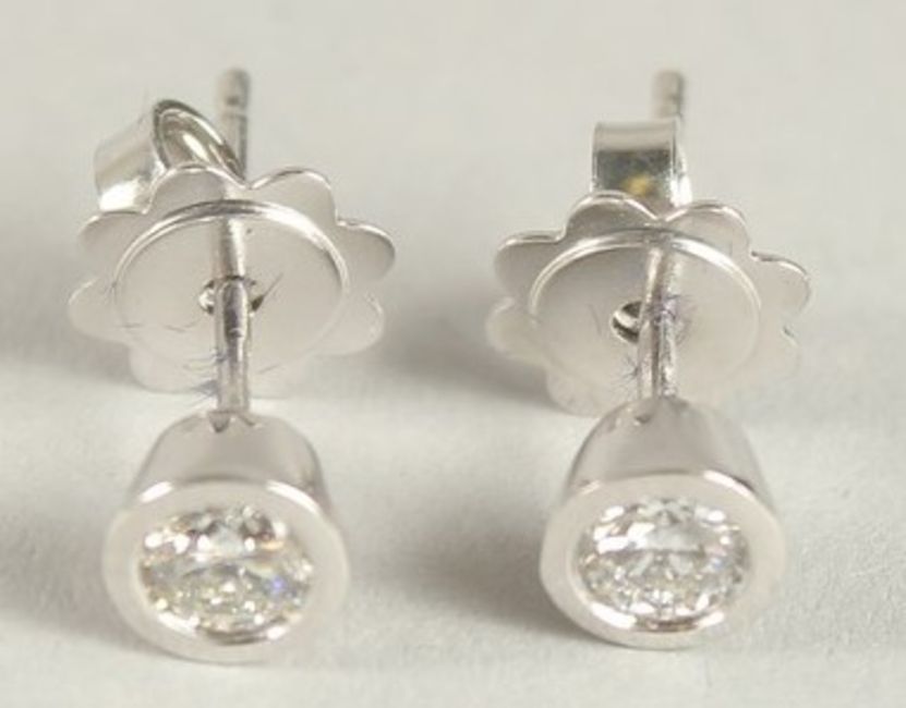 A PAIR OF 18CT WHITE GOLD AND DIAMOND EAR STUDS.