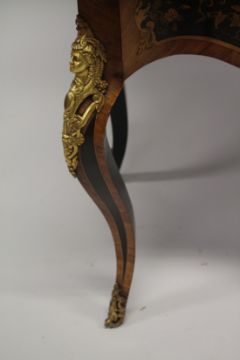 A VERY GOOD VICTORIAN KINGWOOD INLAID FOLDING TOP CARD TABLE, the top inlaid with musical trophies, birds, floral inlay, the top opening to reveal a velvet interior, on four curving legs.