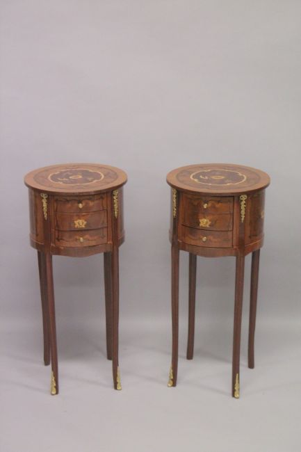 A PAIR OF LOUIS XVITH STYLE INLAID CIRCULAR BEDSIDE CUPBOARDS with three drawers and an under-tier.