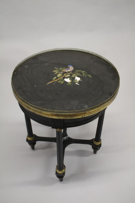 A GOOD 19TH CENTURY DERBYSHIRE CIRCULAR MARBLE TOP TABLE, inlaid with flowers and birds in coloured marbles and pietra dura brass gallery, on four tapering legs with uniting stretchers.