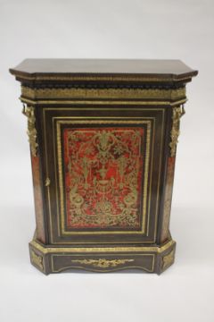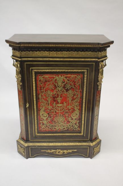 A VERY GOOD VICTORIAN BOULLE INLAID CABINET with plain top and sides, the panel door to the front with a large Boulle panel, ormolu mounts and caryatid figures.
