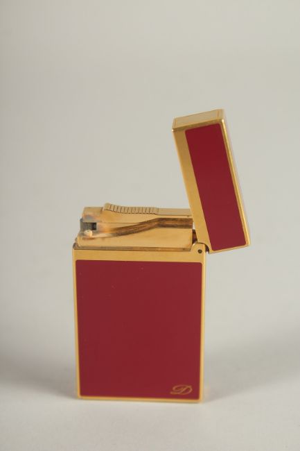 A DUPONT RED ENAMEL AND GILT METAL CIGARETTE LIGHTER.