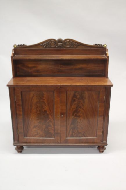 A LATE REGENCY MAHOGANY CHIFFONIER with shaped back, single shelf over a pair of double doors, on turned legs.