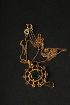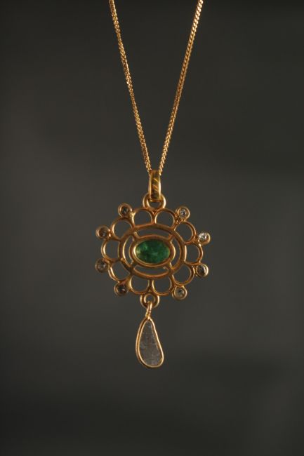 A FANCY PENDANT in yellow metal set with oval emerald, rose-cut diamonds and a suspended slice diamond, boxed.