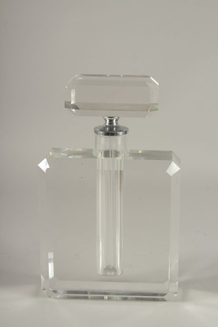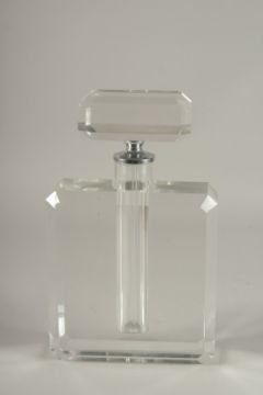 A HEAVY CUT GLASS SCENT BOTTLE AND STOPPER.