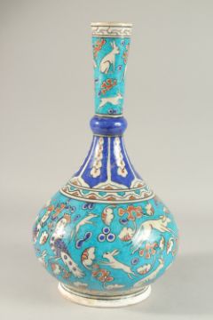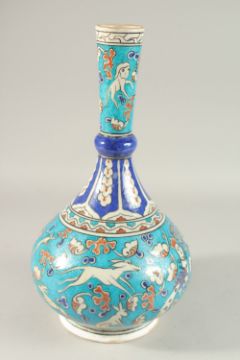A LARGE TURKISH IZNIK GLAZED POTTERY VASE, painted with harpies and animals, 40cm high.