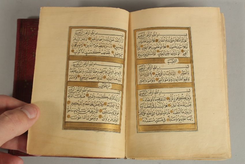 A 19TH CENTURY OTTOMAN LEATHER BOUND QURAN, for Hafez Othman Alkamily study of Ahmed Najati, dated 1266, 14.5cm x 10.5cm.