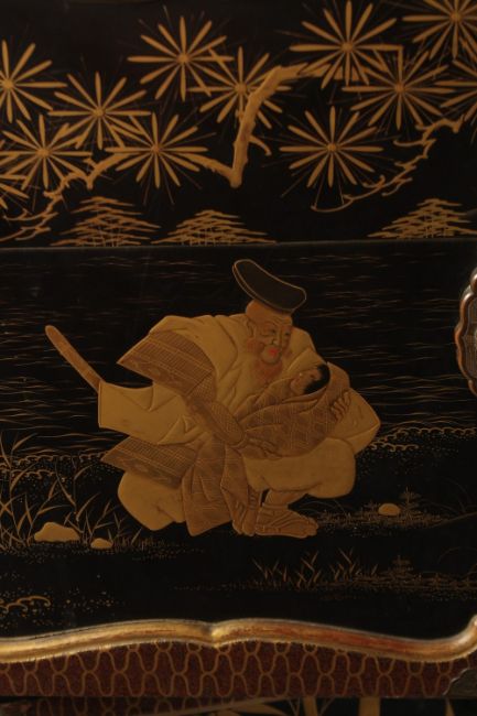 A FINE JAPANESE MEIJI PERIOD BLACK AND GILT LACQUERED CABINET, raised on stand, the two doors opening to reveal eight drawers, with further large drawer beneath the doors, finely decorated with a scene of gilded figures and foliate motifs, 7cm high (on stand), 55cm wide, 40cm deep.