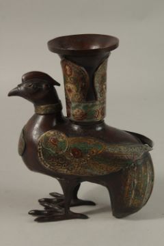A FINE CHINESE CLOISONNE ENAMELLED BRONZE BIRD FORM CENSER, 23.5cm high.
