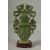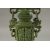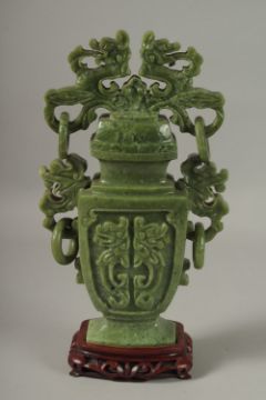 A LARGE CHINESE CARVED GREEN HARDSTONE LIDDED VASE, with twin drop ring handles and carved with dog of fo, mounted to a wooden stand, 41cm high.