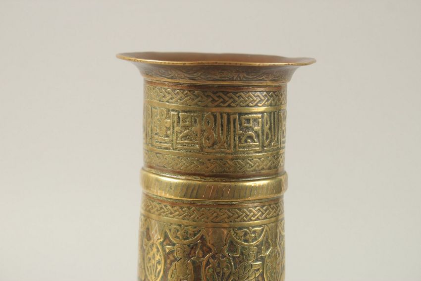 A FINE 19TH CENTURY PERSIAN BRASS CANDLESTICK WITH SILVER INLAYS, the body engraved with seated figures, 29cm high.
