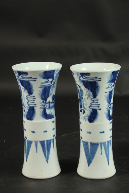 A PAIR OF CHINESE BLUE AND WHITE PORCELAIN GU SHAPE VASES, decorated with figures, 21cm high.