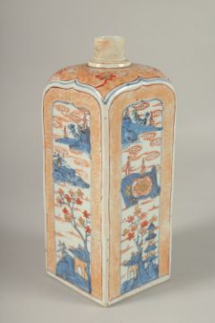 A FINE JAPANESE OR CHINESE PORCELAIN SQUARE FORM BOTTLE, painted with tall panels of landscape scenes, 24.5cm high.