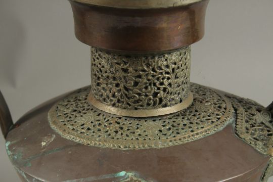 A LARGE 19TH CENTURY TIBETAN WHITE METAL MOUNTED COPPER EWER, 29cm high.