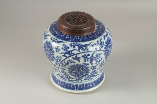 A CHINESE BLUE AND WHITE PORCELAIN JAR AND HARDWOOD COVER, 23cm high.