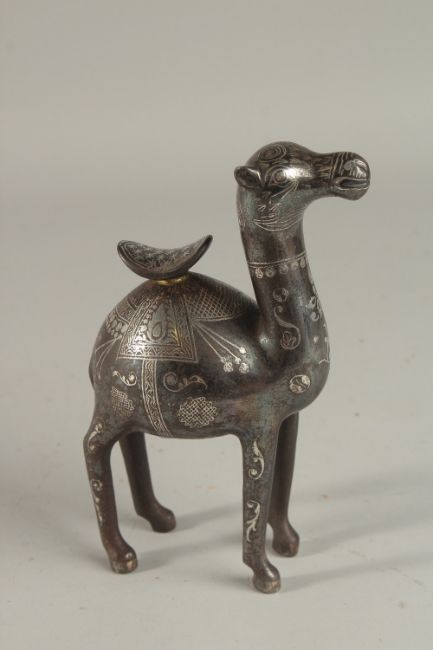 A FINE PERSIAN SILVER INLAID STEEL CAMEL, 19.5cm high.