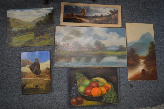 A group of six small unframed oil paintings depicting figure subjects, landscape etc.