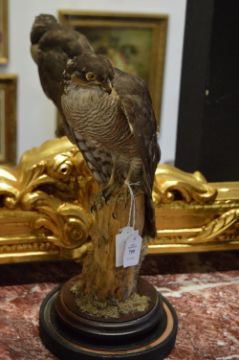 Taxidermy sparrowhawk mounted a naturalistic wooden base.