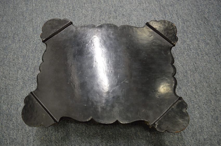 A Victorian papier mache gilded and inlaid desk stand with pair of cut glass inkwells.