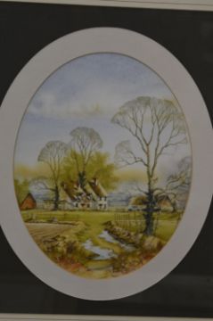 Andrew Findlay, a pair of oval watercolour scenes of houses in a landscape, signed.
