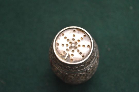An Eastern white metal barrel shaped double ended pepperette with engraved decoration.