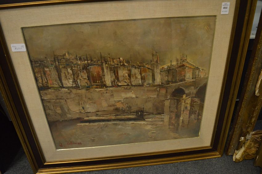River scene with buildings and fishing boat with bridge, oil on board, signed.
