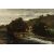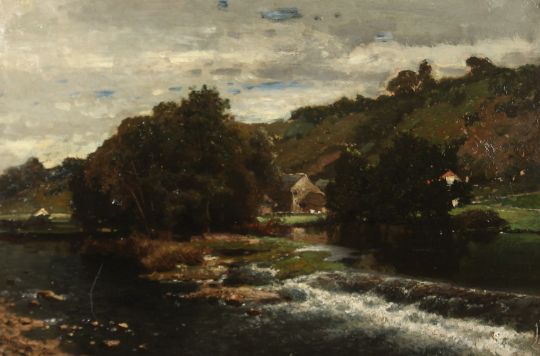 River over rapids, a fern amidst the trees, oil on panel.