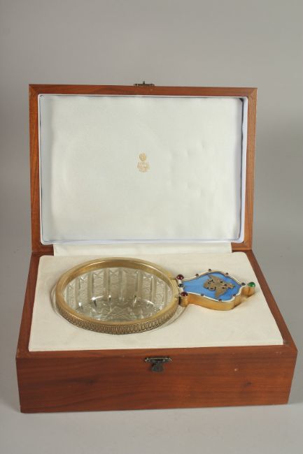 A VERY GOOD RUSSIAN SILVER, CUT GLASS AND ENAMEL KVOSCH with Russian Eagle and hardstones.